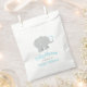 Stylish and sweet custom baby shower favour bag features an adorable little newborn baby elephant calf with heart shaped splashes and custom text that can be personalized. Colour scheme of sky blue, grey, and white - colours are perfect for welcoming a baby boy.