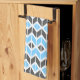 This kitchen towel features a colourful geometric herringbone pattern in sky blue, dark grey, and white.