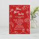 This playful and appetizing design bursts with fun energy on a vibrant red background, featuring whimsical white line art doodles of pizza slices dripping cheese, a margherita pizza, pizza paddle, maracas, mushrooms, tomatoes on the vine, a teddy bear, and a baby bottle for a cheeky food-meets-baby twist. 🍕🍼 The hand-drawn style adds a lively, hand-sketched charm with swirling vines and bouncy elements, creating a joyful, celebratory vibe full of humor and delicious anticipation perfect for a girl's lively shower. ✨