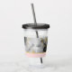 Personalized tumbler with an elegant and modern marbled pattern. White, black and smoky grey marble with thin ribbons of faux-gold swirls throughout the pattern. A light pink gradient background beneath the marbled pattern.
