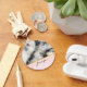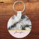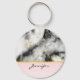 A keychain with an elegant and modern marbled pattern. White, black and smoky grey marble with thin ribbons of faux-gold swirls throughout the pattern. A light pink gradient background beneath the marbled pattern.