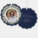 Send warm holiday wishes with this elegant botanical Christmas ornament card, featuring your favourite family photo encircled by a wreath of snowberries, cotton blooms, and soft sage green foliage on a classic navy background. Personalize the front with your custom greeting, name, and the year for a timeless seasonal touch. The back of the ornament card offers space for your personal message in white lettering, making it a beautiful and heartfelt keepsake to share with family and friends.