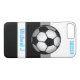 Trendy iPhone 6 case with a black, grey, white, and blue colour scheme, a large illustrated soccer ball, and personalized with your name or custom text.