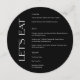 Modern wedding menu card with unique typography for "Let's Eat" and your wedding menu in clean sans serif font. Classic solid black for the background and white colour for the menu on the front, black again for your names and wedding date on the back - customize or delete the text on the back and use this menu card for birthdays, rehearsal dinners, anniversaries or any other celebration and party.