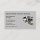 Special needs handicap wheelchair transportation theme modern business cards with image of a transport vehicle in the background you can use on our cards or replace with your own industry logo or graphic. An organized layout for a transportation or taxi service for handicapped people. Presented on high quality UV mat coated business card paper stock.