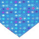 Table runner in a mid-century modern pattern of seven-point, outlined stars, in soft, celestial shades of aqua, turquoise and violet, on a deep cerulean blue background