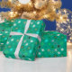 Wrapping paper in a mid-century modern pattern of seven-point, outlined shades of aqua, seafoam green and jade, on a turquoise / peacock background