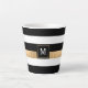 Modern chic latte mug done in a bold black, white and gold tone horizontal stripe pattern. A black and gold square monogram block, on the front of the mug, has a white single letter monogram ready to personalize.