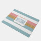 Chic front door mat done in a pink, white blue and gold striped pattern. A white decorative text area, in the middle of the mat, has blue text ready to personalize. What a lovely way to welcome guests to your home.