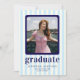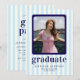 Celebrate in style with our chic and modern graduation party invitation! Featuring playful light blue and white stripes as the backdrop, this design is adorned with bold navy blue text for a vibrant and contemporary flair. Perfectly tailored to showcase a cherished photo, it’s a sophisticated way to invite loved ones to join the celebration.