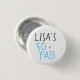 Modern and stylish 50th birthday button with the text fifty and fabulous in bright blue elegant script. Simply add your name to this 50th birthday celebration custom button. Perfect birthday gift for a modern, stylish and elegant 50 year old. Exclusively designed for you by Happy Dolphin Studio!
