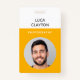 Modern and professional photo badge featuring your photo in a circle frame with trendy minimalist typography. On the back is pace for contact information, web site or social media as well as your custom logo or QR code. This is the bold orange yellow version.