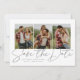 With three vertical photos and a modern script written "save the date," this card is the perfect way to announce your engagement and upcoming wedding to friends and family. The chic grey text is bold and modern but still sophisticated. The customizable text on the front has room for names, date, location and other information like a wedding website. The back is a neutral grey and white striped pattern. The colour is editable by clicking "Customize."
