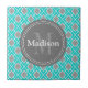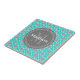 A girly, modern, geometric diamond Moroccan lattice trellis pattern in teal blue and grey with a white border outline. This chic graphic pattern also features a circle nameplate for your custom monogram and name. A monogrammed elegant gift for women that love cool designer patterns in a stylish colour palette.