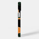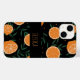 This summer themed phone case design features a fruit pattern of oranges, and green leaves on a dark black background. This makes a great gift for a friend or family member, and you can personalize this item with a custom name in the centre.