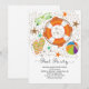 Contemporary pool party invitation featuring an orange & white inner tube with flip flops, beach ball & sunglasses set on a sand dotted background with starfish.
