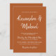 Elegant trendy typography wedding invitation in simple monochromatic rusty orange sunset and white hand lettering featuring big bride's and groom's names brushed calligraphy script. ++++++++++++++++++ You can change colours of text and background after selecting CUSTOMIZE further option. ++++++++++ The invitation is suitable for modern style wedding receptions.