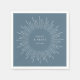 Modern light blue sunburst frame, slate blue personalized paper napkins. Template provides two spaces for names and event date.