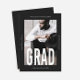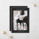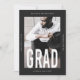 Modern and minimal black and white one photo graduation announcement features grad in big type, and a stylish overlay.