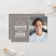 Modern graduation party invitation with a clean taupe colour block, cap icon, and bold varsity-style typography. Personalize with the graduate’s photo, name, class year, and school. The back features a coordinating taupe layout for open house details like date, time, location, and RSVP.