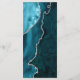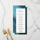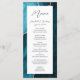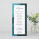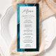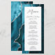 This elegant, modern wedding menu features a watercolor teal blue agate background trimmed with silver faux glitter. The text appears in elegant charcoal grey handwriting and sans serif fonts on a white rectangle. The agate design is repeated on the reverse.