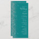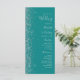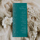 The left-hand edge of this elegant modern wedding program features a silver faux glitter design. The customizable text combines silver grey handwriting, copperplate and italic fonts on a teal blue background.
