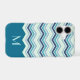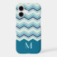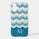 This case features a pretty chevron stripe pattern in colours of blue, turquoise, teal, and grey. The bottom third of the case is solid matching teal blue, making a nice contrast to the chevrons. Your monogram is in matching light turquoise blue on the solid portion. Unique and attractive with your own personalized touch!