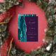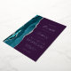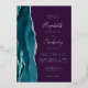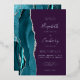 The left-hand edge of this elegant modern wedding invitation features a teal blue watercolor agate border trimmed with faux silver glitter. The customizable text combines real silver foil handwriting, copperplate and italic fonts on an opulent deep purple background. The reverse side features a matching teal and silver agate design.