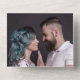 Unique, minimalist, modern, contemporary bright teal blue and yellow all-in-one wedding invitation with QR code, monogram with hand drawn love couple birds, trendy handwritten script and custom picture of the at the back.