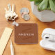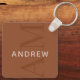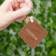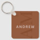 This stylish terracotta brown keychain features a modern layout with vertical monogram in big type, and your name in simple red tinted white horizontal type.