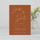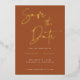 Modern Terracotta Gold Foil Calligraphy Script Wedding Save the Date Card with gold foil. Change foil colour to another colour if you like. Background colour can also be changed.