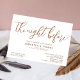 Elevate your wedding rehearsal dinner with our "The Night Before" Wedding Rehearsal Dinner Invitation. Featuring elegant brown calligraphy on a clean white background, this invitation embodies modern simplicity and sophistication. Ideal for couples who appreciate a minimalist aesthetic, this design is perfect for any wedding theme, from rustic to boho-chic. Whether you're planning a vintage-inspired event or a bold, modern celebration, this invitation sets the tone for an unforgettable evening. As part of your rehearsal dinner decorations and supplies, this card complements any décor, ensuring a cohesive and stylish presentation. Make a lasting impression with this timeless and elegant invitation.