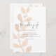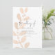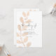 A tinted background of artsy peach leaves runs from the bottom to the top of the page to the left hand side, with the typography overlaid on top. A stylish set typography in black for the main heading the Wedding Of complementing the rest of the text which you can easily personalise.