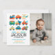 HONK, BEEP, VROOM TRANSPORTATION BIRTHDAY THEME. RED GREEN AND BLUE CUTE COLORFUL VEHICLES INCLUDING CAR, TRAIN, HELICOPTER, GARBAGE TRUCK, BUS AND POLICE CAR. EDITABLE KIDS BIRTHDAY INVITATION
