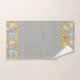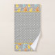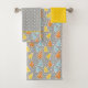 Modern trees and polka dot pattern bathroom towel set. It features a pattern of modern Christmas trees in yellow, orange and aqua blue on grey background, snowflakes around then and polka dots.