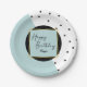 A beautifully stylish look for a feminine themed birthday party, this contemporary design features scattered confetti polka dots in black over a white background on one half of the design with a solid dusty light blue colour block on the opposite half. A golden double frame with matching blue background surrounds the centre text in beautiful style. Lovely handwritten script type face spells out "Happy Birthday" in large lettering to add emphasis to the happy occasion. Personalize the name with the birthday guest of honour's name. Note: These paper plates are available in 2 sizes. Shown here in the 7" size which is a good choice for serving birthday cake and small items, the larger 9" size is a better choice for serving more substantial party treats. Be sure to select the size that best suits your needs.