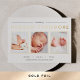 Modern and stylish birth announcements feature three newborn photos aligned side by side and trimmed with gold foil, with baby's name across the top in gold foil lettering. Personalize with baby's birth stats beneath.