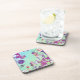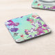 Summer themed coasters backed in aqua tones with a collage of tropical florals in purple, mauve shades.