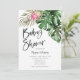 Modern baby shower invitation card featuring watercolor illustration of tropical greenery including monstera, palm leaves, pink king protea flower. Perfect for a gender neutral shower in the summer.