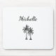 Tropical beach mousepad, with a black and white palm trees hand drawn illustration. With black typography lettering, you customize with your own name. A modern professional addition to your electronics accessories.