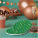 Paper plates in a Mid-Century Modern pattern of twinkling stars in shades of lime green, jade, aqua and turquoise, outlined in complementary colours, on a deep emerald green background