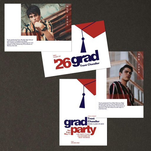 The design blends modern editorial style with a simple, organized layout that highlights the graduates graduating year. A dedicated space for a photo and short bio on the back allows you to personalize the announcement and share a bit about your graduate’s accomplishments and future plans.
