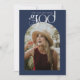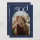 un script de typographie moderne propre et chic avec un cadre photo voûté sur un arrière - plan bleu marine. Customisez facilement avec vos photos de remise de diplômes et les détails de l'invitation à l'avant et à l'arrière.
