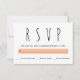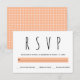 This elegant wedding RSVP card showcases a modern typography design with a touch of peach fuzz. The combination of black and white typography, along with the peach accents, creates a sophisticated look. The RSVP text is presented in a charming hand-drawn style font, giving it a contemporary feel, while the peach band adds a vibrant splash of colour to the overall design. Turning the card over reveals a white geometric pattern set against a peach background. What sets this design apart is the ability to fully customize the text, text size, font, and even the shade of peach used, allowing you to tailor the card to your personal preferences and create a one-of-a-kind wedding RSVP card that perfectly reflects your style and taste.