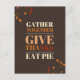 This modern Thanksgiving Holiday Postcard features a bold and stylish typography design with the phrases "Gather Together, Give Thanks, Eat Pie" in warm autumn colours. The dark brown background and minimalistic accents of leaves and berries add a contemporary touch, making it perfect for sending festive holiday greetings with a fun and family-oriented message.