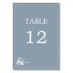 A modern and unique wedding table number including the name of the bride and groom in dusty blue. Personalize your own Dusty Blue wedding with this design and colour in our collection.
