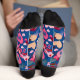These Valentine’s Day socks feature a vibrant, playful design bursting with romantic elements. The bold, royal blue background is adorned with pink and cream-coloured hearts, each carrying the editable monogram “MW,” adding a personalized touch throughout the pattern. Complementing the hearts are whimsical bows in shades of white, pink, and red, paired with delicate, blooming flowers for a charming and festive look. The black toe and heel sections offer contrast, grounding the colourful design. Perfect for adding a dash of love and flair to any outfit, these socks are an ideal Valentine’s Day accessory or gift.