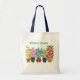 A natural-colour tote bag with a navy blue handle and a row of pots of colourful flowers, from a handpainted paper collage by Judy Adamson. Great gift for a gardener, a florist or anyone who loves flowers! Customisable.