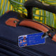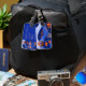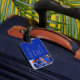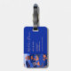 This luggage tag features a vibrant, stylized landscape with a whimsical and modern aesthetic. It uses a rich color palette of deep blues and orange an to create a layered, multi-dimensional scene with imaginative details, including flying fish, birds, a small sailboat, and coral reefs. The design is characterized by clean lines and high-contrast colors that give it a playful yet sophisticated feel.