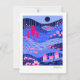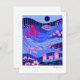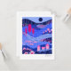 This notecard features a vibrant, stylized landscape with a whimsical and modern aesthetic. It uses a rich color palette of deep blues, pinks, and purples to create a layered, multi-dimensional scene with flying fish, birds and flowers.